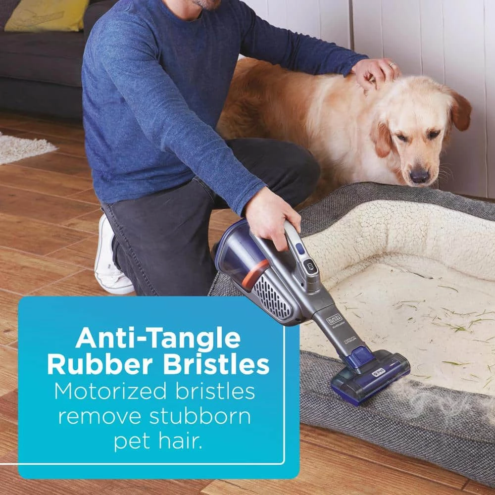 Eliminate dirt that’s out of reach, but not out of sight. Extend your reach with our longest built-in crevice tool. The versatile 20V MAX* dustbuster AdvancedClean+ Cordless Pet Hand Vacuum cleans hard to reach areas with less effort. 4X more powerful suction* and Powerboost with the touch of a button to tackle any mess. Anti-tangle rubber bristles powered to lift stubborn pet hair. The XL 750 mL dust bin, up to 145% more runtime** and a battery indicator to keep you moving. Keep your hands clean with the ONE-TOUCH easy empty dust bin. Go The Extra Length with the 20V dustbuster AdvancedClean+ Cordless Pet Hand Vacuum.