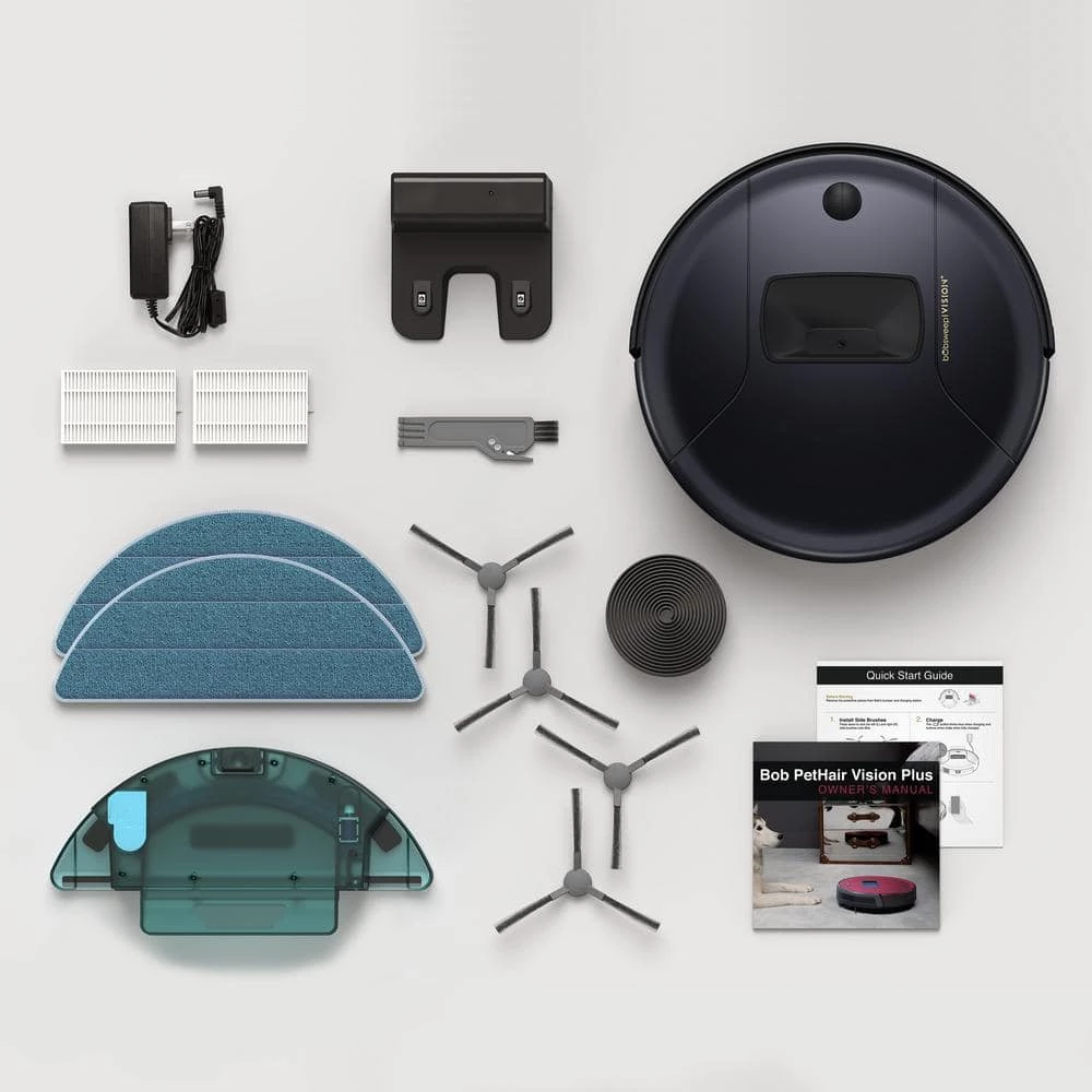 Plus brings more features to his predecessor, Bob PetHair vision: in addition to app control, voice control, localization and mapping, a high-definition camera, and 2.4G Wi-Fi connectivity, the plus now adds 5G Wi-Fi connectivity, a mop attachment with water reservoir, and boosted vacuum power. Bob’s main brush and twin side brushes spin in tandem to pick up large scraps and bits. His large dustbin packs pet hair, dust, and dirt; it is waterproof, so it can be easily rinsed for a thorough clean. NoSweep stripes can form boundaries that Bob will not cross. Bob comes with an unrivaled 60-day money back guarantee, a 2-year limited warranty, a 2-year battery warranty, 5-years of subsidized repair plan, and a lifetime of customer service.
