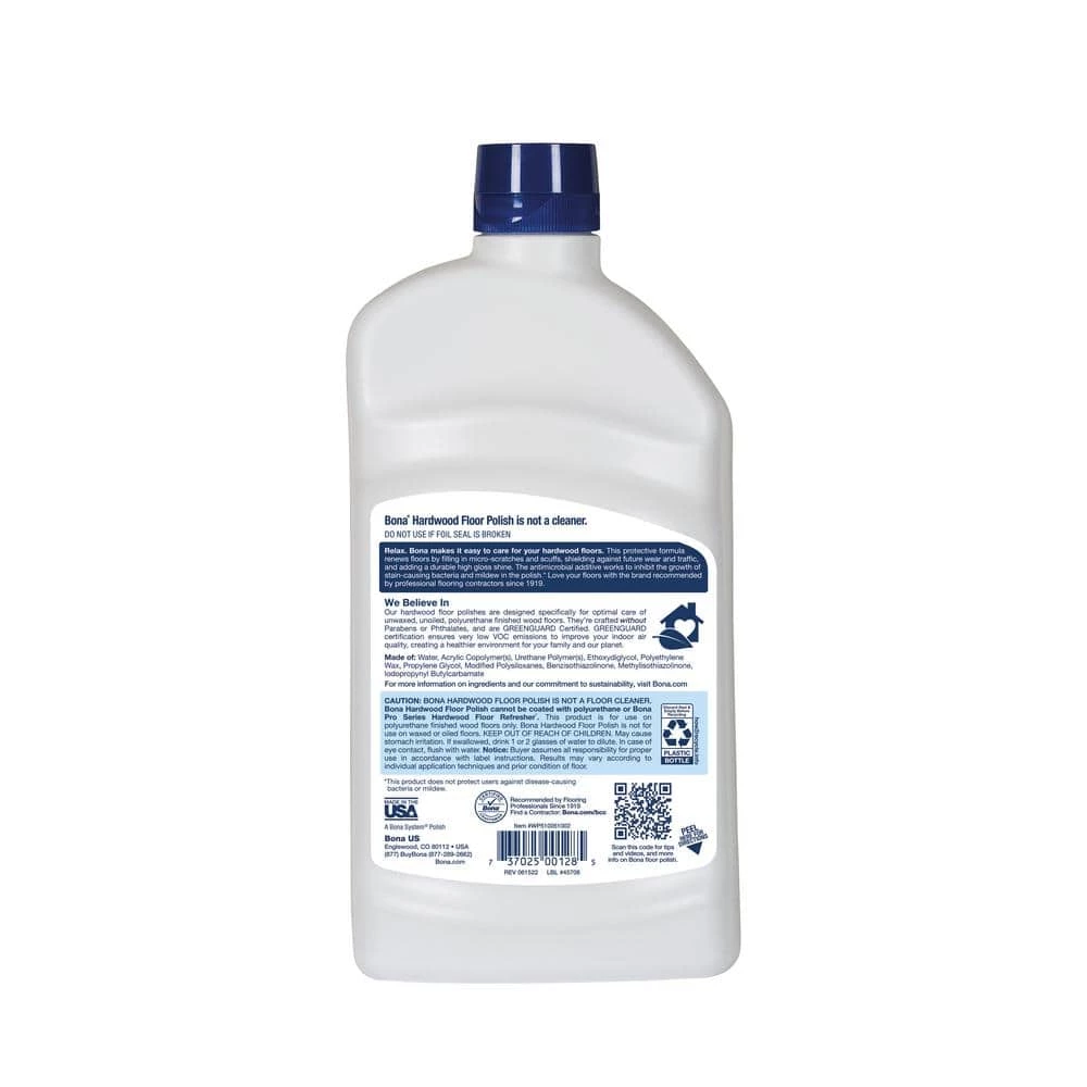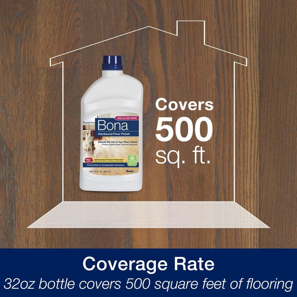 Bona Hardwood Floor Polish offers a protective formula that renews floors by filling in micro-scratches and scuffs, shielding against future wear and traffic, and adding a durable high gloss shine. For extra protection, the antimicrobial additive works to inhibit the growth of stain-causing bacteria and mildew in the polish. Use every 2-4 months to keep floors revitalized and looking their best. Covers about 500 sq. ft. This product does not protect users against disease-causing bacteria or mildew.