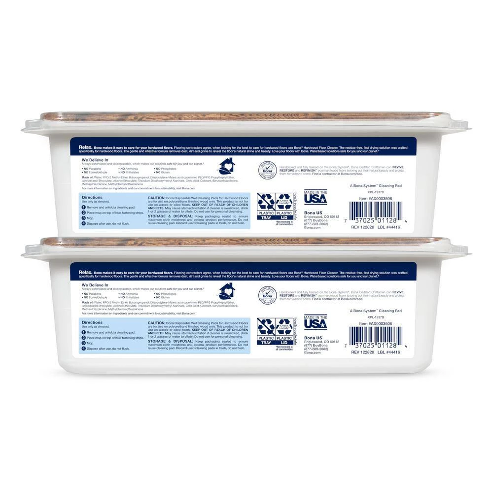 Make your life easier with this convenient 2-pack bundle of Bona Disposable Wet Cleaning Pads for Hardwood Floors. for a thorough clean quickly, Bona Disposable Wet Cleaning Pads feature a multi-layered design infused with Bona Hardwood Floor Cleaner. The residue-free, fast drying solution cleans hardwood floors by gently and effectively removing dust, dirt and grime to reveal the floor’s natural shine and beauty. These extra-large cleaning pads utilize locking strips for easy attachment and removal from the mop for superior quick and easy cleaning.
