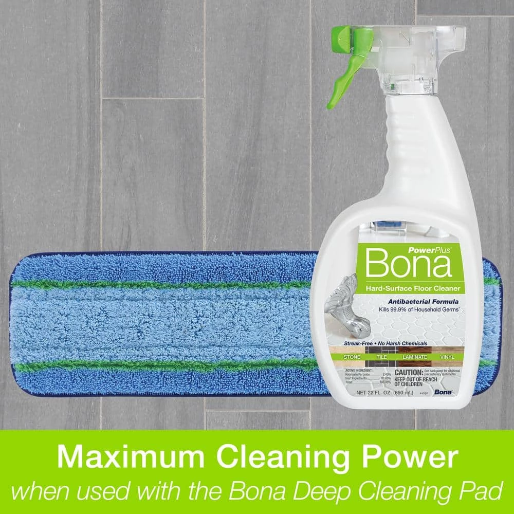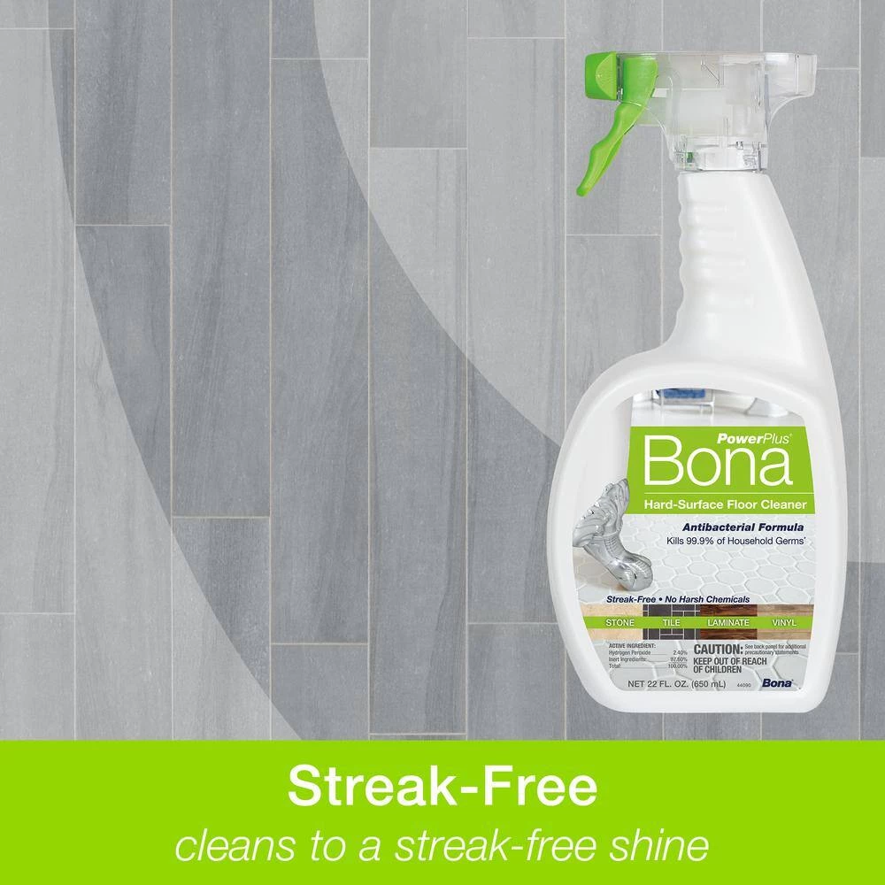Performance you expect, with the ingredients you can trust. Clean without compromise. Bona’s PowerPlus Antibacterial Hard-Surface Floor Cleaner cleans and disinfects with the power of Hydrogen Peroxide. This ready to use antibacterial cleaner is uniquely formulated to powerfully clean and effortlessly remove stubborn stains while killing 99.9% of household germs. It leaves your home smelling clean and fresh with no harsh chemical smell. Directions for use: Step #1: Vacuum, sweep or dust mop, Step #2: To Clean: Mist, and then proceed to step #3 OR To Disinfect: Spray until thoroughly wet, wait 10-minutes, then proceed to Step #3: Clean Rinse and wring cleaning pad often to avoid streaking.