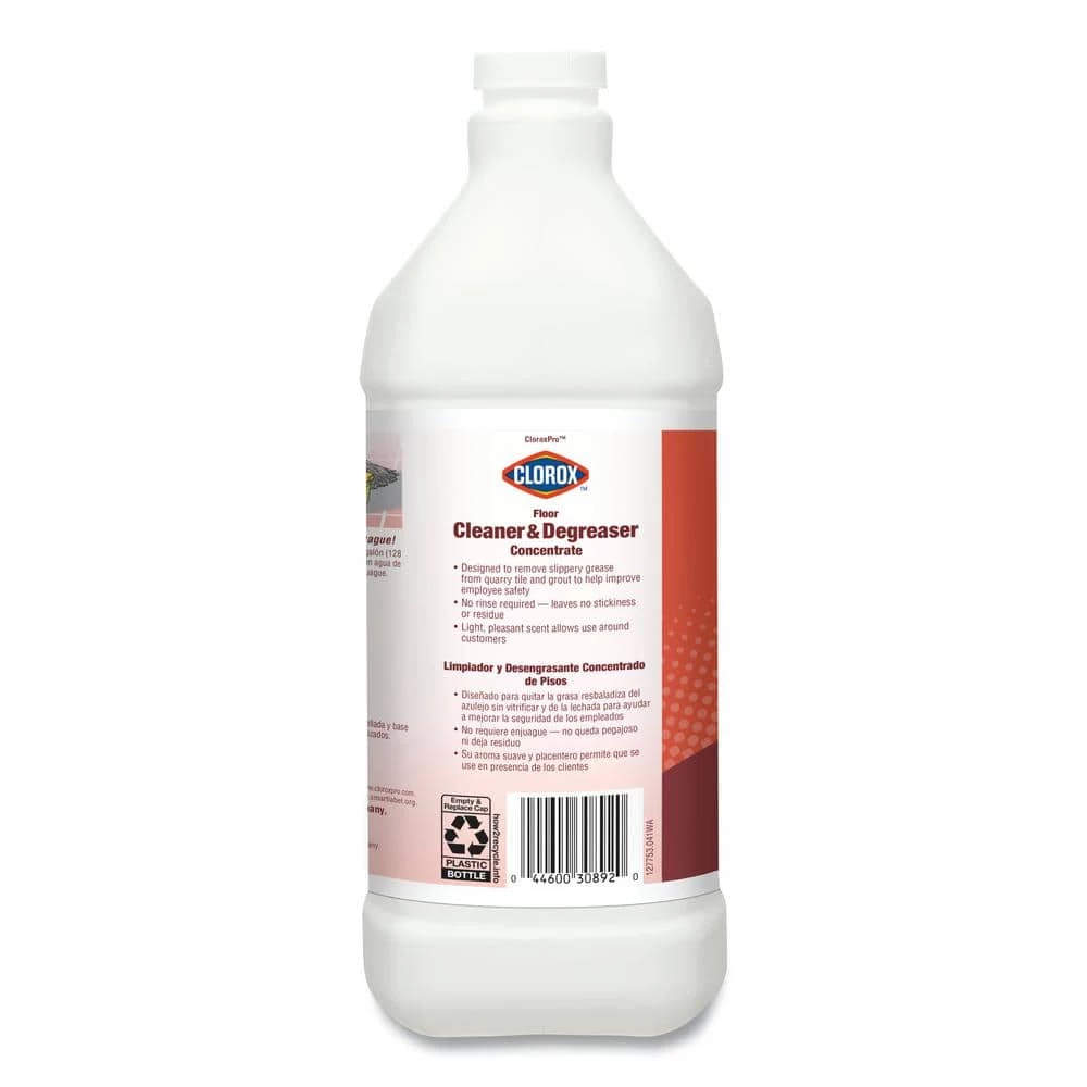 Clorox Professional Floor Cleaner & Degreaser lifts grease out of porous quarry tile and grout. This economical concentrate delivers 32 Gal. of effective cleaning product. With a light pleasant scent, it can be used around customers. From Clorox Commercial Solutions, this floor cleaner is perfect for use in offices, commercial kitchens, restaurants, lobbies, high-traffic restrooms and other business facilities. No rinsing is required. Application: Floor Cleaner/Degreaser; Applicable Material: Vinyl Composition Tile (VCT); Solid Vinyl Tile (SVT); Linoleum; Sheet Vinyl; Laminates; Glass; Sealed Cement/Concrete; Ceramic Tile; Terra Cotta; Terrazzo; Quarry Tile; Dirt Types: Dust; Food Residue; Grease; Grime; Organic Matter; Scuff Marks; Smoke Residue; Soil; Spills; Scent: Pleasant.