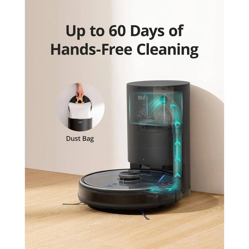 - Up to 60 days of hands-free cleaning: the auto-empty station uses 25,000 Pa of suction to remove dust from the RoboVac easily, it is collected in a dust bag, which can be used for up to 60 days, before needing to be replaced, (according to Eufy laboratory data, duration will vary depending on your home environment and number of pets)