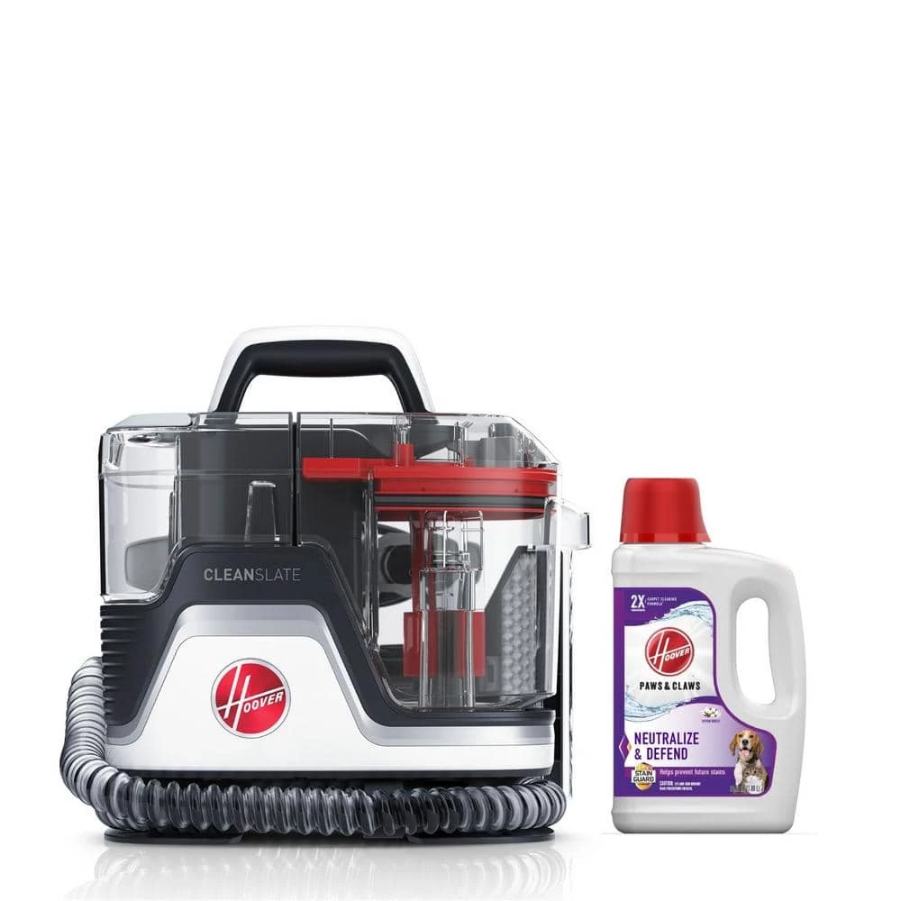 The Hoover CleanSlate Pro Portable Carpet and Upholstery Spot Cleaner Machine combines powerful suction, versatile tools, and the performance of the Paws and Claws Carpet Cleaning Formula to tackle tough stains and messes. With the Wide Path Cleaning Tool for large areas like stairs and the Tight Spot Tool for crevices and tough to reach areas, you will have the flexibility you need to clean messes of any size. It’s portable, for quick removal of spills, and stains on the go and with a longer cord you can easily move between areas. With the Hose Rinse tool, your machine stays clean and ready for the next mess. The Paws and Claws advanced formula helps prevent future stains and it even continues to work after you’ve finished cleaning. It’s formulated with enzymatic cleaning ingredients to neutralize odors and leave your home smelling fresh. Use this solution to clean carpets, area rugs, upholstery and car interiors.