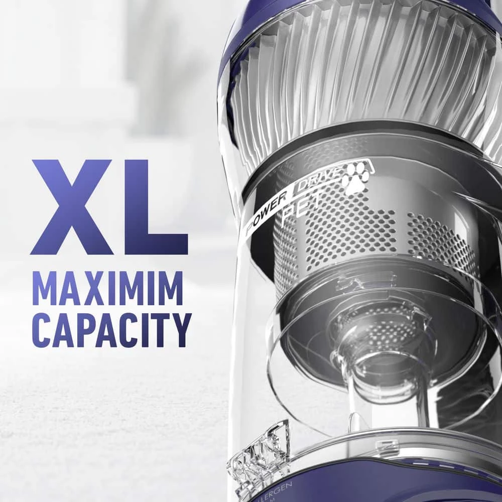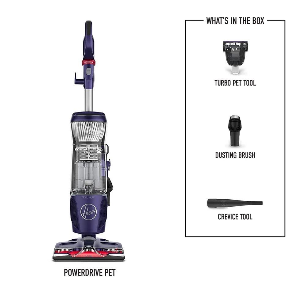 Hoover PowerDrive Pet Upright Vacuum is perfect for homes with pets! It combines the power and suction you trust to deliver a deeper clean. Its swivel steering design effortlessly maneuvers around furniture and into tight spaces with ease, while the new Advanced Action Brush Roll is engineered to tackle deep-down embedded dirt and reduce hair wrap. The on/off brush roll feature allows you to transition from carpet to hard floor with the touch of a button to optimize pet hair removal on all floor types. Turn the brush roll ON for deep cleaning on carpets and OFF to prevent scatter of debris on hard floors. With 13 ft. of cleaning reach, multi-purpose pet tools and an extra large capacity dirt cup, you’ll be able to achieve a whole home clean so you can love your pets, not the hair they leave behind!
