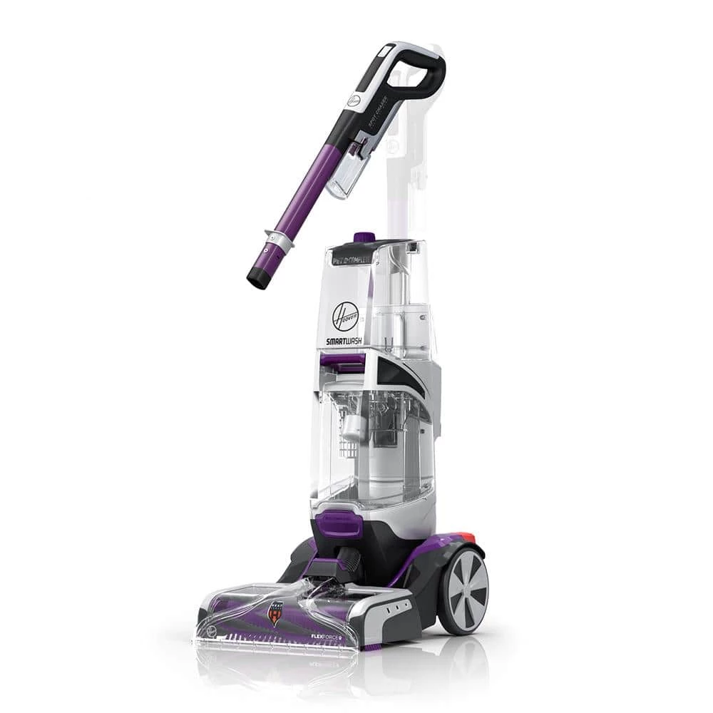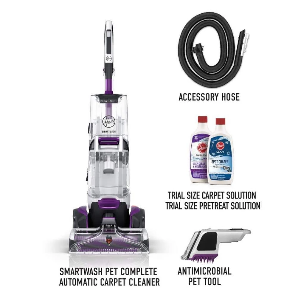 The Hoover SmartWash Pet Complete Automatic Carpet Washer is just as easy to use as our original SmartWash. Simply push forward to clean and pull back to dry. No trigger and no mixing solutions. It’s literally as easy as vacuuming. The SmartWash Pet Complete is designed specifically for homes with pets. Use the Spot Chaser Pretreat Wand to pretreat stains before you clean or as you go. Plus, the Antimicrobial FlexForce Pet Power Brushes remove deep-down dirt while resisting pet odors. For those pet stains on stairs or furniture, SmartWash Pet Complete comes with an Antimicrobial Scrubbing Tool.