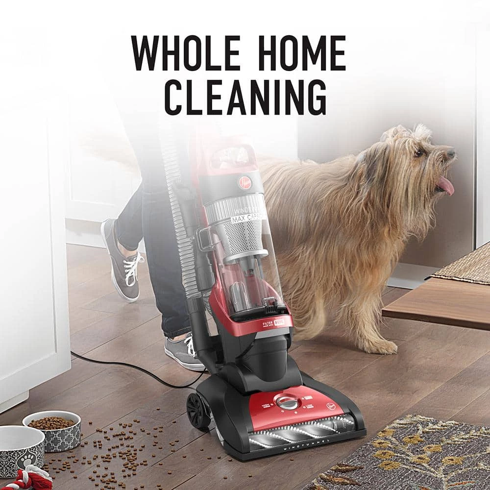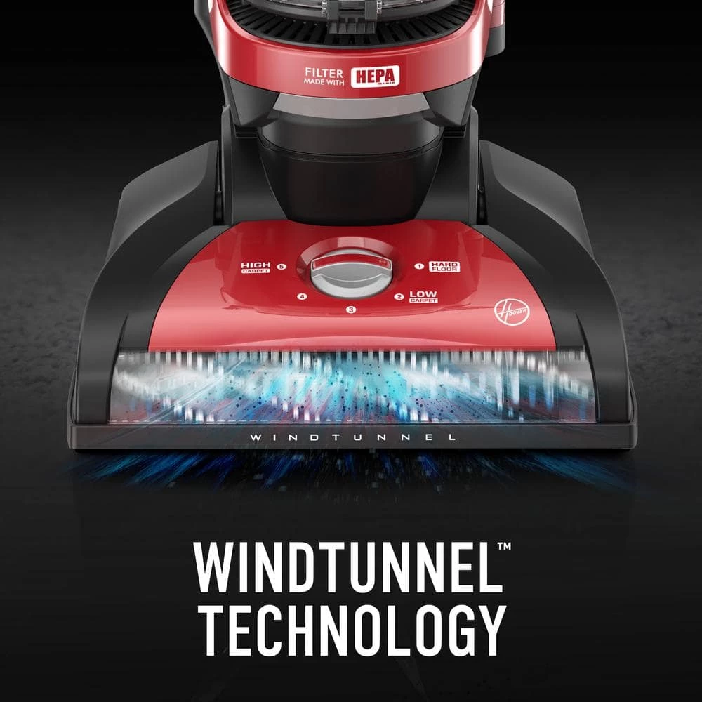 The Hoover WindTunnel Max Capacity Vacuum Cleaner is equipped with everything you need for a heavy duty clean from floor to ceiling. Confidently power through messes on any floor type, then use the above floor tools and extension wand to get into tight, hard-to-reach places with ease. It comes with ScatterGuard Technology and 5 in. height adjustments that let you easily get an optimal clean on any floor type without scatter.