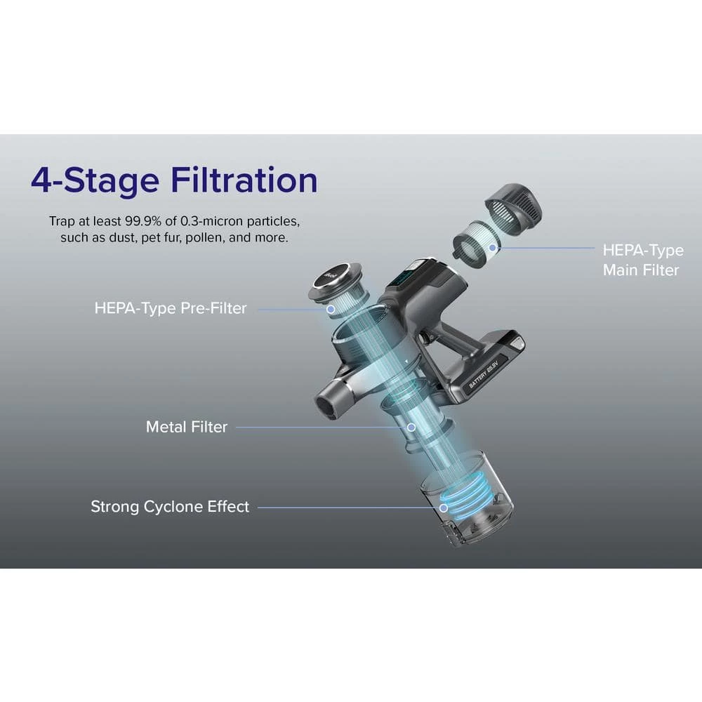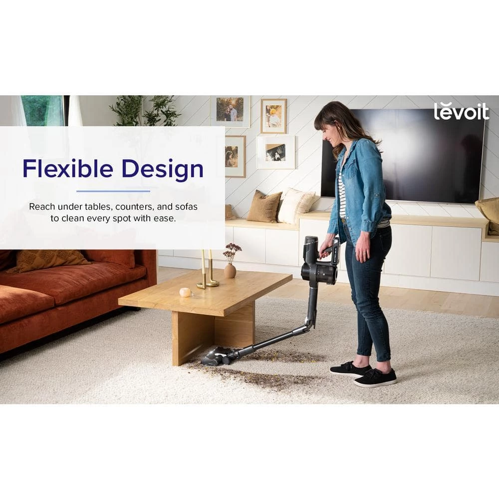 With the LEVOIT VortexIQ 40 flex cordless stick vacuum, you can easily clean hardwood floors and carpets, as well as reach under furniture and clean cars. DPC Technology (Dynamic Power Control Technology) senses the level of debris travelling through the vacuum and adjusts the suction power level for you, conserving battery life. Vacuum for up to 40-minutes before recharging the vacuum on the mountable charging dock. The powerful 130AW suction power uses a 4-stage HEPA filtration system to trap at least 99.9% of 0.3-micron particles, leaving your floor clear of dust, pet fur, crumbs, pollen, and more.
