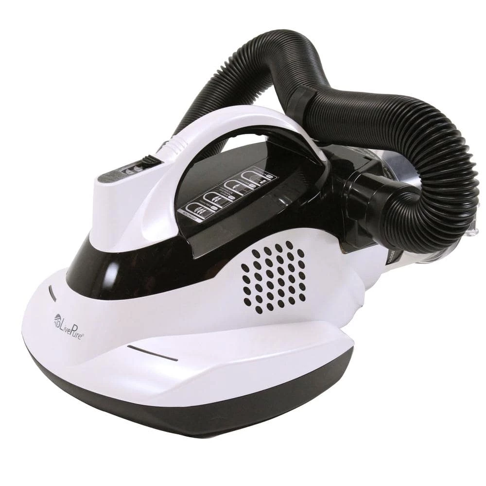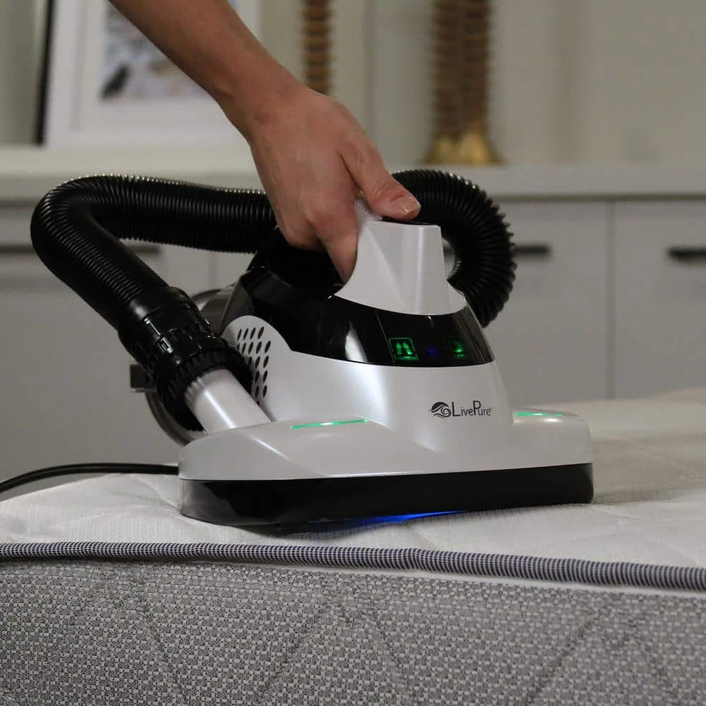The LivePure Ultramite UVC Dust Mite Vacuum (LP5000DMVC) neutralizes the allergen causing dust mites and particles living deep inside your mattress, bedding, furniture, carpet and clothing. Allergens cause allergies, irritated skin, congestion, itchy eyes, and lack of sleep if not regularly sanitized. The combined efficiency of the UVC light, covered rolling brush and HEPA filter makes this household vacuum more efficient at removing allergens than a regular vacuum because this technology is designed to clean deep inside household fabrics instead of only the surface. The UVC light kills dust mites and allergens. The covered rolling brush vibrates the particles from soft surfaces without disrupting the fabric, such as a maid bed. The true HEPA filter then captures 99.97% of particles as small as 0.3 microns from the air.
