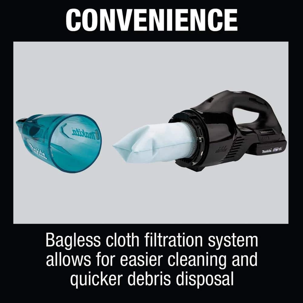 - Bagless cloth filtration system allows for easier cleaning and quicker debris disposal