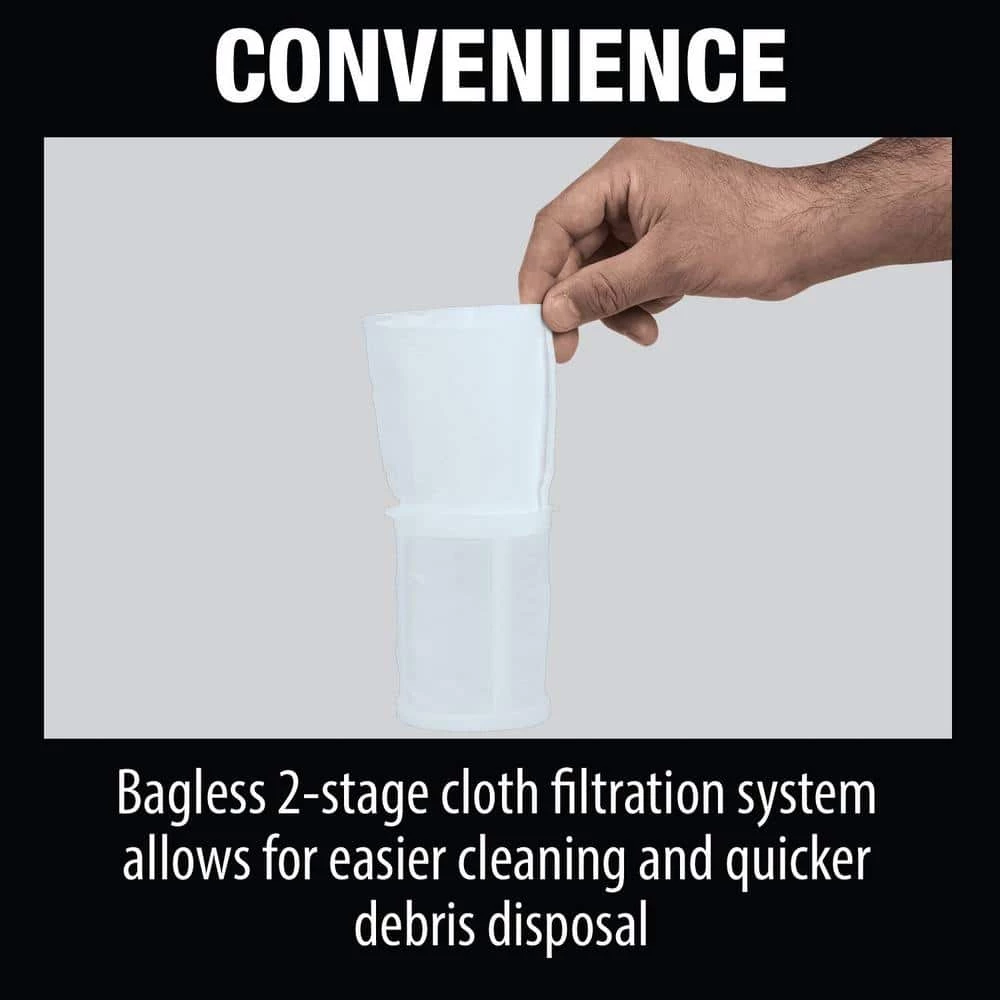 - Bagless 2-stage cloth filtration system allows for easier cleaning and quicker debris disposal