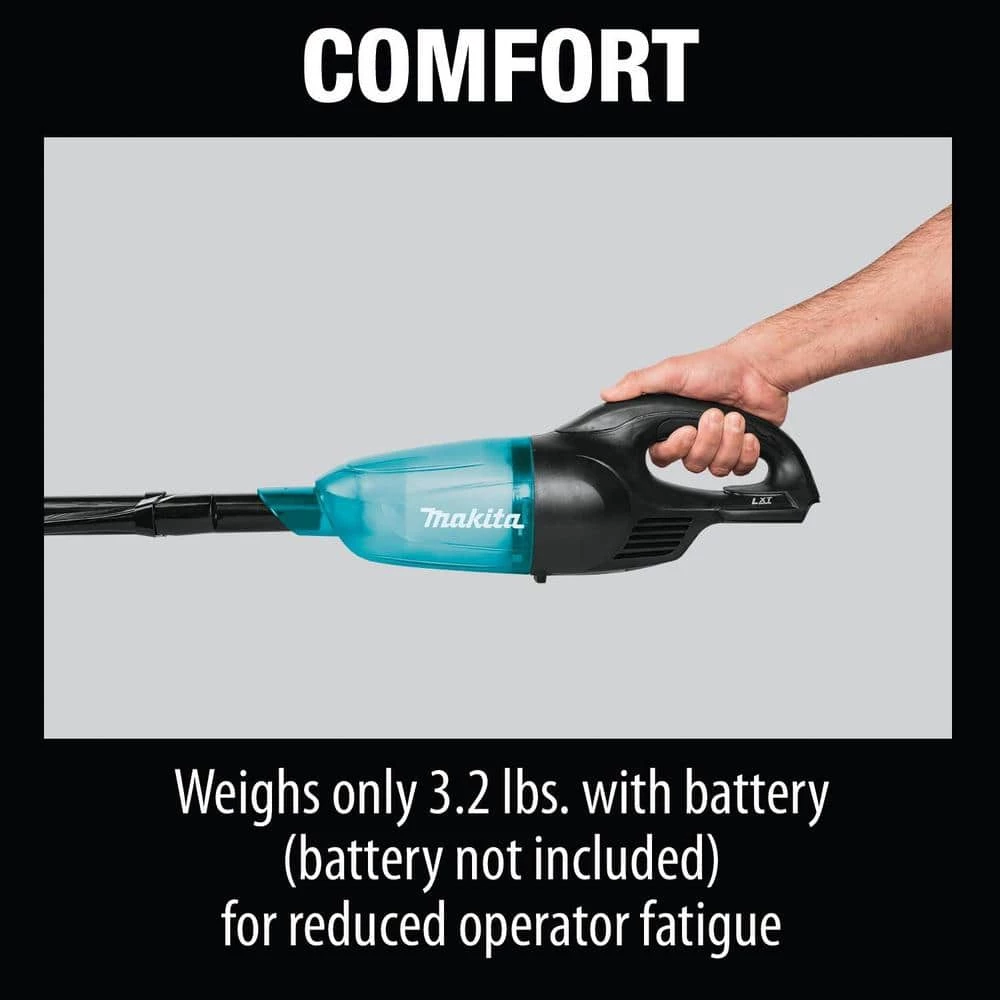 The Makita 18-Volt LXT Lithium-Ion Cordless Vacuum (XLC02ZB, tool only, batteries and charger sold separately) is a compact and powerful solution for fast and efficient cleaning. At only 18-3/4 in. L this compact vacuum can be used as a hand-vac or with the floor nozzle extension for floors, carpets and hard-to-reach spaces. It has a redesigned floor nozzle for improved debris collection and a bag-less 2-stage cloth filtration system for easy cleaning and quick debris disposal. When using an 18-Volt LXT 5.0 Ah battery (sold separately), users will get up to 33 minutes of continuous use on a single charge. It is compatible with Makita 18-Volt LXT and 18-Volt LXT Compact Lithium-Ion batteries. It’s part of Makita’s expanding 18-Volt Lithium-Ion system, the world’s largest cordless tool system powered by 18-Volt Lithium-Ion slide-style batteries. Makita 18-Volt Lithium-Ion batteries have the fastest charge times in their categories, so they spend more time working and less time sitting on the charger. For improved tool performance and extended battery life, Makita created Star Protection Computer Controls. Star Protection is communication technology that allows the Star Protection-equipped tool and battery to exchange data in real time and monitor conditions during use to protect against overloading, over-discharging and overheating.