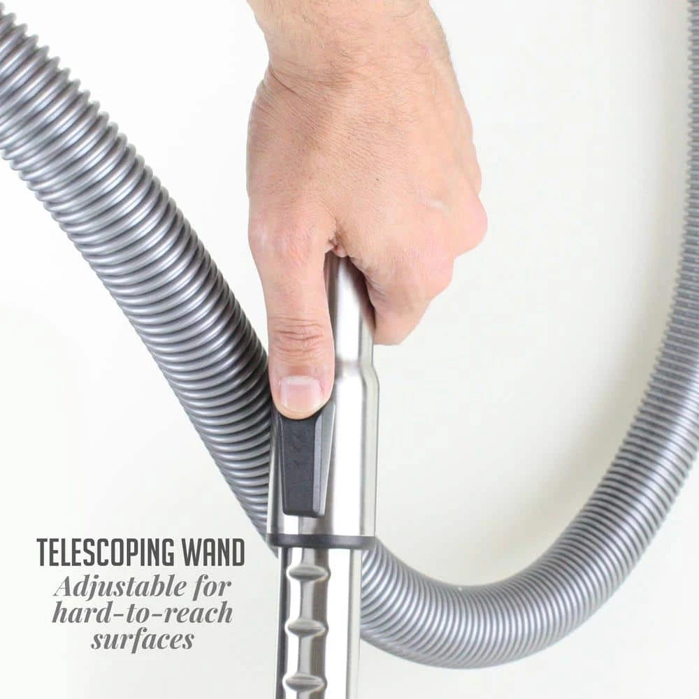 - Convenient – This vacuum comes with a step button to turn on/off, automatic cable rewinder, 360° hose swivel, and telescopic wand that will help you get to hard-to-reach areas.