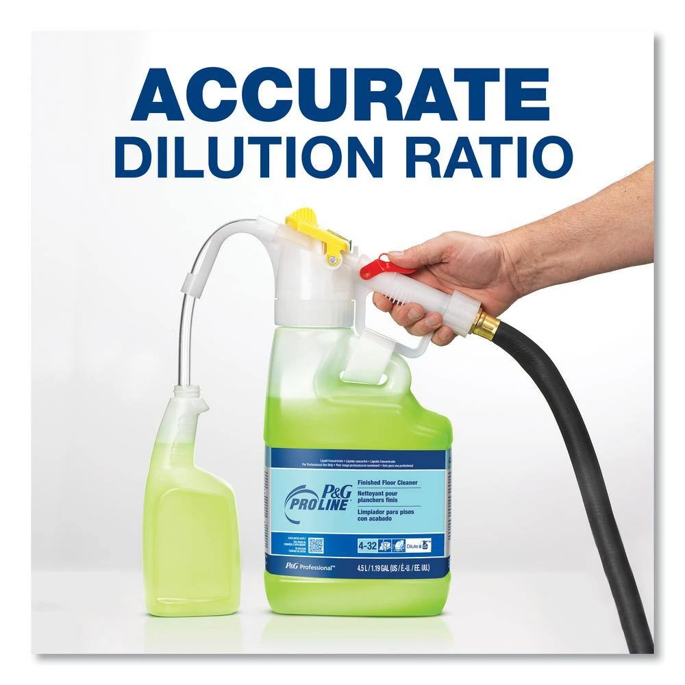 Get the superior cleaning power of P&G Professionalâ„¢ products – now in an easy, portable dilution system! Acurate dilution ratio with no wall-mounted equipment or maintenance required. Eronomic design for easy transport and storage. Easy to use slide bar—select between product and water for diluting or rinsing. Compatible with all standard garden and chemical hoses with 3/4″-11.5 NH fittings. P&G Pro Line® Finished Floor Cleaner. Application: Floor Cleaner; Applicable Material: Finished Floors; VCT; Terrazzo; Stone; Ceramic; Finished Hardwood Floors; Dirt Types: Dirt; Grease; Particulate Soils; Scent: Fresh.