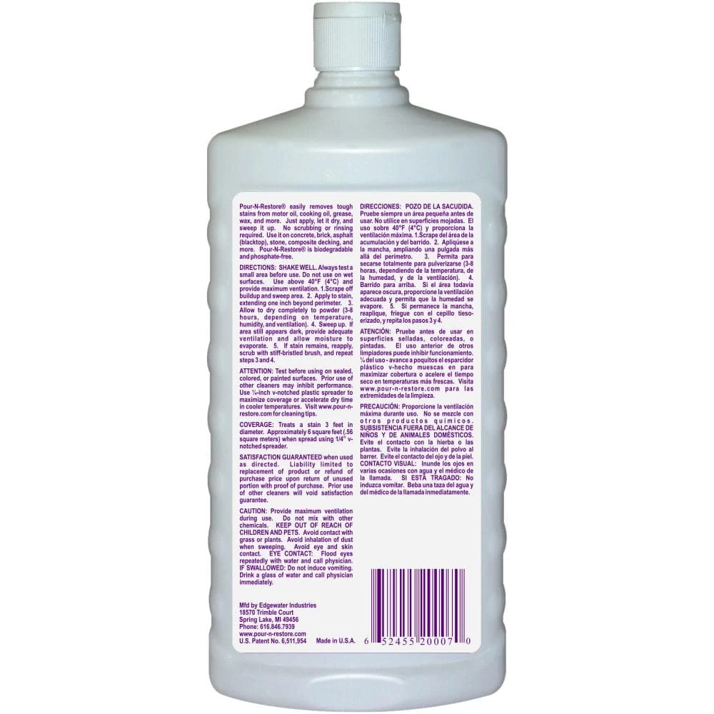 Pour-N-Restore oil stain remover lifts embedded oil as it dries from a liquid to a powder. Just apply, let it dry and sweep it up. No scrubbing or rinsing is required. Pour-N-Restore removes stains from motor oil, grease, transmission fluid, cooking oil and more. It is ideal for driveways, garage floors and patios.