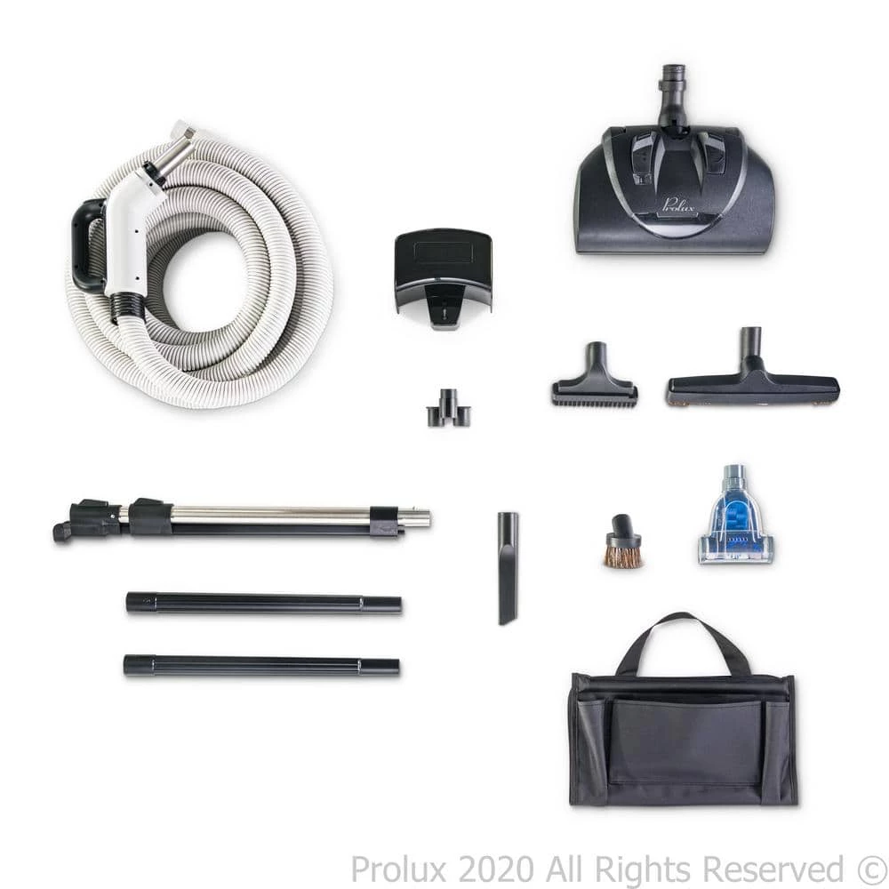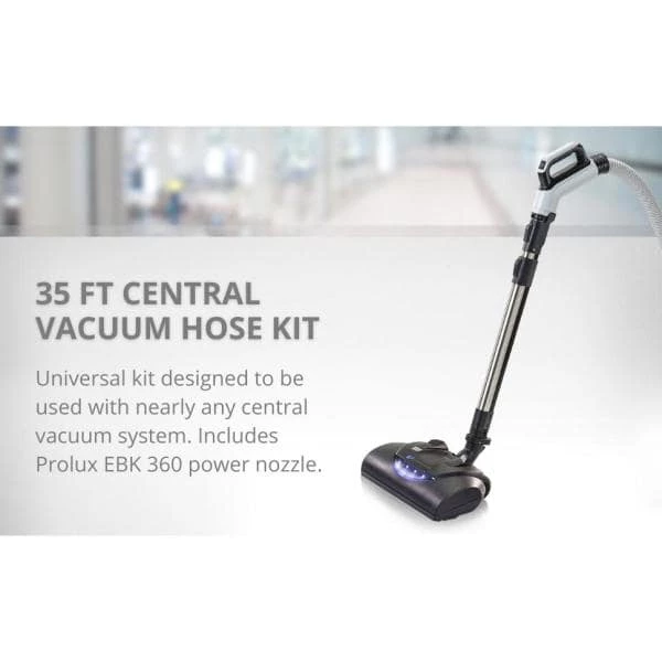 Universal Premium Prolux Central Vacuum Kit comes with The Wessel Werk EBK 360 power nozzle and a tool for nearly any job around your house. The premium quality universal 35 ft. Prolux hose can withstand heavy abuse. Crush proof hose is light weight and offers superior durability. Comfortable handle with a 3-way switch allows you control of the system. The handle switch controls the unit and has the ability to control the power nozzle separately. Switching between carpeted and hard floor surfaces is simple. Wessel Werk makes one of the most durable power nozzles on the market. The EBK 360 features include: soft rubber bumper and wheels to protect floors and furniture from damage, head height adjustment to ensure the perfect brush roll level for any surface and long lasting LED headlights.4 deluxe Prolux tools, wall mounted hose hanger, clip on wand caddy and hanging tool storage caddy. Prolux tools include: Telescopic wand that adjusts to perfect height for nearly any user, crevice tool for corners and in between cushions, duster brush with soft bristles that wont damage furniture, blinds or ceiling fans, floor tool that works on hard floor and carpeted surfaces and an upholstery tool for couches, mattresses and vehicle upholstery. Storage caddy are perfect to keep your accessories clean and organized and are easily mounted in a discrete area. Works on all central vacuum systems including: Prolux, Electrolux, Honeywell, Vacumaid, Beam, Hoover, Aggressor, NuTone etc.
