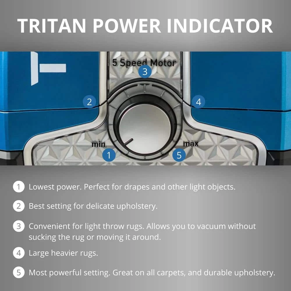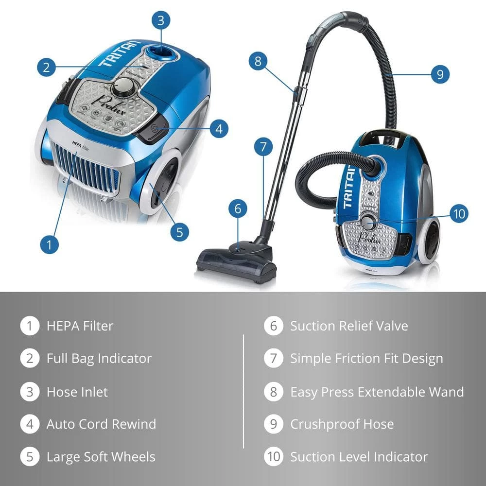 Are you looking for an easy-to-use inexpensive but dependable powerful deep cleaning vacuum? Then consider the Prolux Tritan. It has an amazing 140 CFM of power at the vac, Sealed HEPA filtration, On board tools, Adjustable Power Knob on vacuum allows user to adjust power from quiet delicate vacuuming (like dusting) to full power for deep cleaning, rubber wheels, long 23-foot retractable cord, adjustable steel wand dependable motor bypass and 1-year warranty. Whether you have allergies, pet hair, hardwood, tile, carpet, or rugs the Prolux Tritan can handle them all.