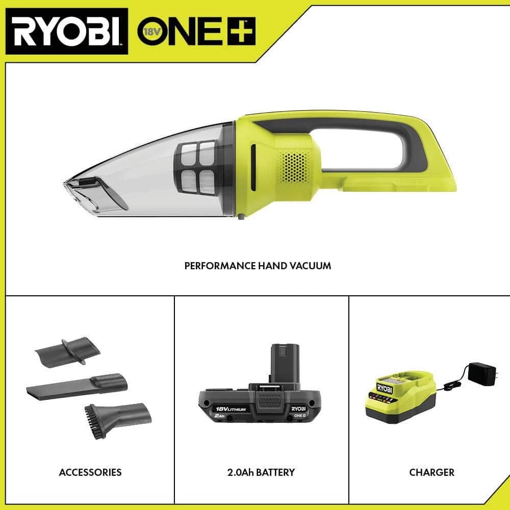 RYOBI introduces the 18V ONE+ Performance Hand Vacuum Kit to our cleaning category. This sleek hand vacuum has a powerful motor that delivers 2X more suction power to pick up a variety of dry debris. Being 25% more compact, this hand vacuum gives users access in hard to reach spaces. The included accessories give users versatility in their cleaning applications. The crevice tool is ideal for cleaning in tight spaces, while the dust brush is gentle for cleaning delicate surfaces. This hand vacuum has an easy to empty dust cup and dual filter system that allows users to quickly clean and maintain their hand vacuum for optimal performance. Best of all, it is part of the RYOBI 18V ONE+ System of over 260 Cordless Tools that all work on the same battery platform. This 18V ONE+ Performance Hand Vacuum Kit is backed by the RYOBI 3-Year Manufacturer’s Warranty and includes an 18V 2Ah Lithium Battery, Charger, Filter, 1-7/16 in. Accessory Adaptor, Crevice Tool, Dust Brush and Operator’s Manuals.