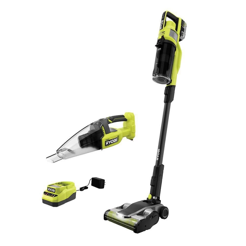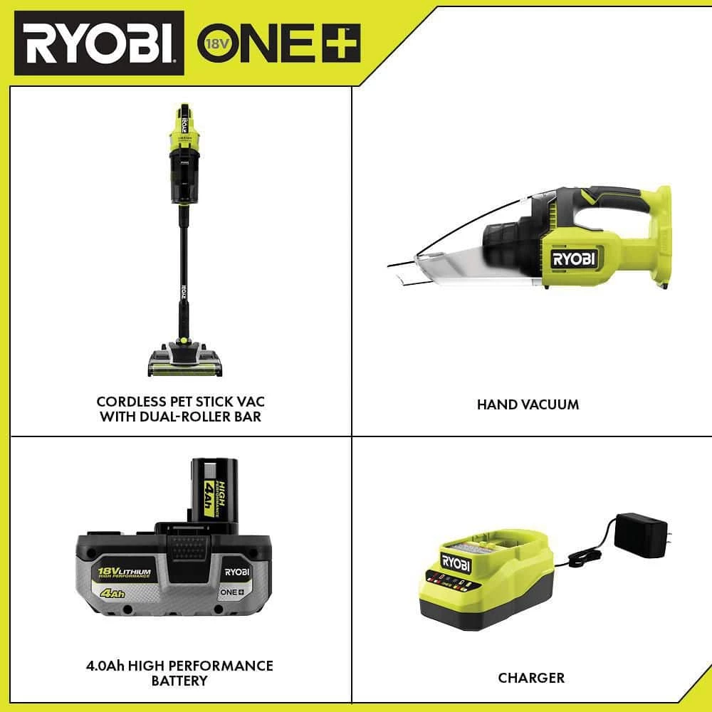 RYOBI introduces the 18V ONE+ HP Brushless Cordless Pet Stick Vacuum Kit with 4.0 Ah HIGH PEROFMANCE Battery, Charger, and ONE+ Cordless Multi-Surface Handheld Vacuum. This improved stick vac not only delivers 2x more suction power but is also 30% lighter and 50% quieter. Combine an intelligent brushless motor with advanced electronics and a high performance battery (sold separately) and you’ve got a vacuum that runs longer (up to 60 minutes per charge) and more efficiently. The dual-roller bar is made of a plush roll and a brush roll that delivers powerful pick-up. This improved hand vacuum has a powerful motor that offers exceptional suction to pick up a variety of dry debris. Cordless convenience gives users the freedom to clean anywhere. Best of all, it’s a part of the RYOBI ONE+ System of over 260 cordless tools that all work on the same battery platform. Backed by the RYOBI 3-Year Manufacturer’s Warranty, the 18V ONE+ HP Brushless Cordless Pet Stick Vacuum Cleaner with Dual Roller Bar includes a Mini Motorized Beater Bar, Crevice Tool, Micro Crevice Tool, Dust Brush, Wall Mount, 18V 4.0 Ah HIGH PERFORMANCE Battery, Charger, 18V ONE+ Hand Vacuum with a Filter, and Operator’s Manual.