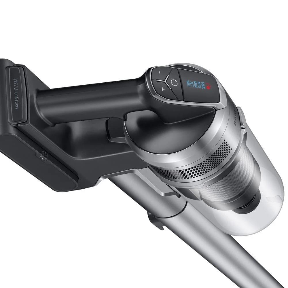 Samsung Jet 75 cordless stick vacuum offers powerful cleaning performance and a lightweight and maneuverable design. Removable, rechargeable battery offers up to 60-minutes of run time, and the digital display features 4 cleaning modes. Compatible with the clean Station which empties the dustbin at the press of a button for a beyond the floor clean.