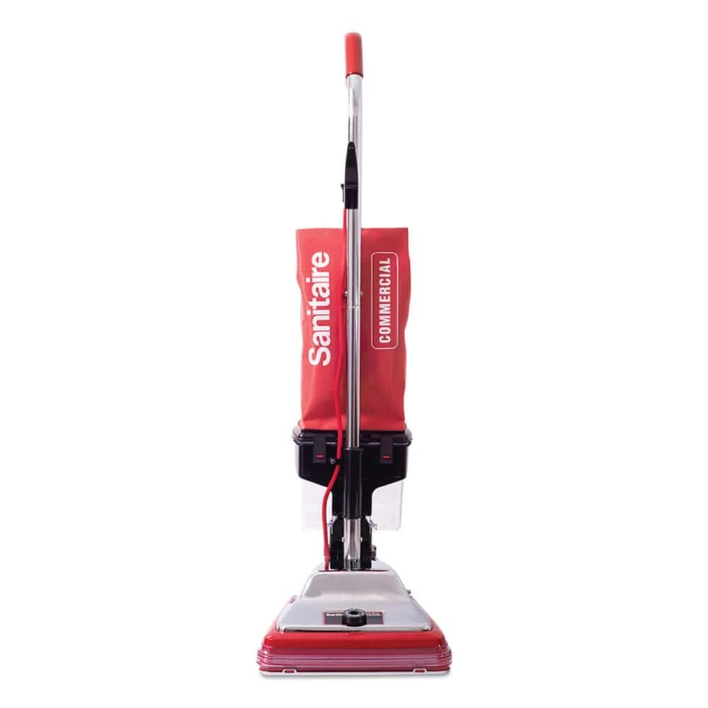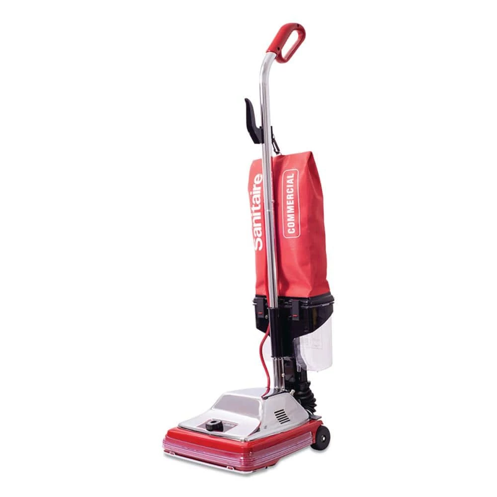 Tradition upright designed with a chrome hood for added durability in the toughest environments. Lowers cost of ownership with a 2,000 hour motor, bagless dirt cup and chrome brushroll with replaceable bristle strips. Quick Kleen fan chamber helps diagnose and clear clogs for easy maintenance. Designed for easy maintenance with quick-release access for emptying the dirt cup and tool-free brushroll and belt replacement. Current: 7 Amp; Voltage: 120-Volt; Tank Capacity: 1.9 Qt.; Color(s): Red.