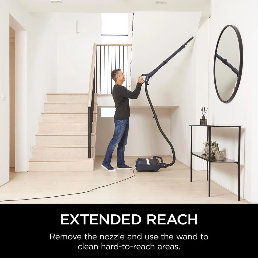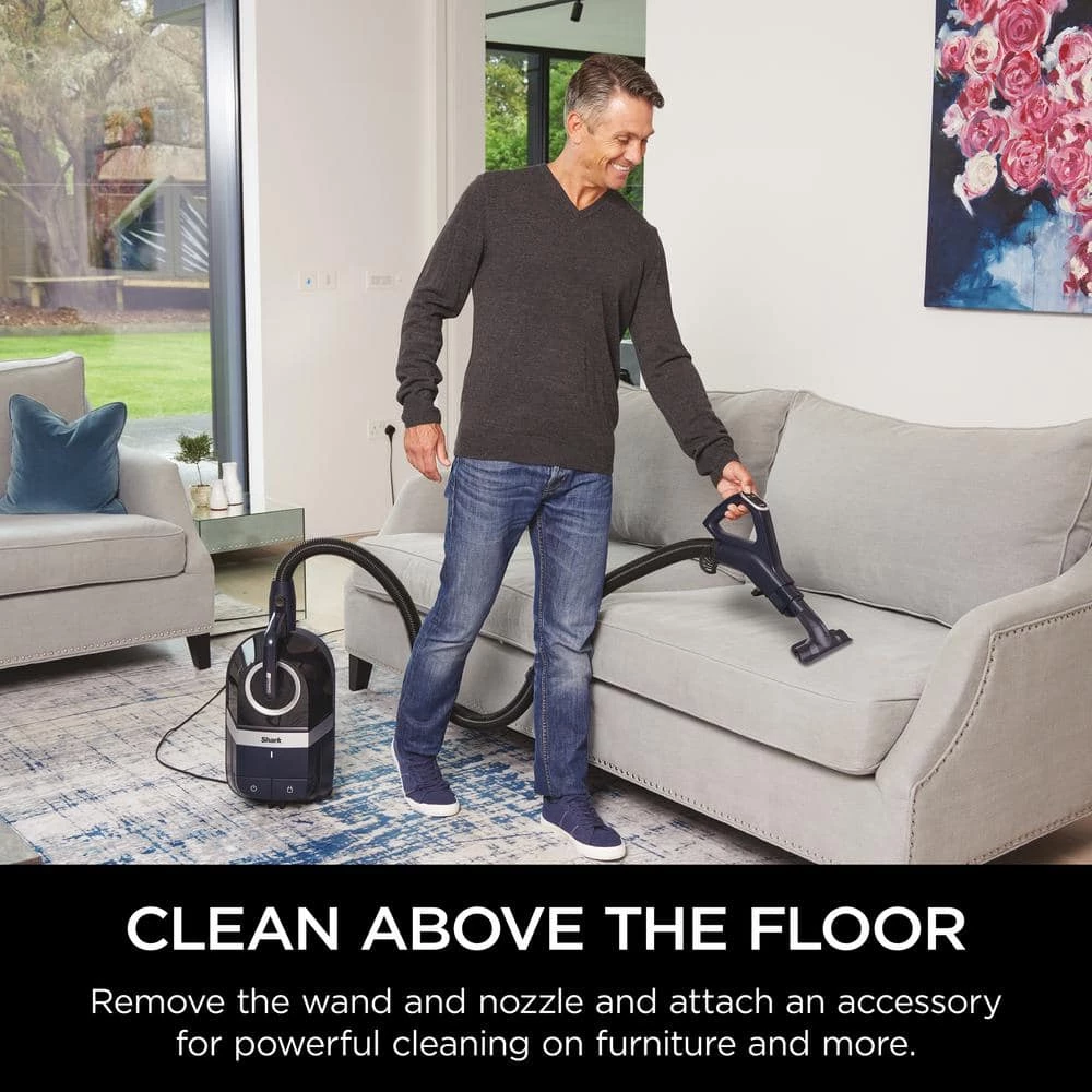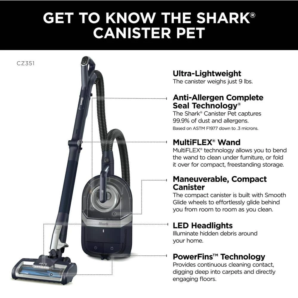 Powerful Shark suction in a compact canister vacuum. Take on any floor type with the PowerFins nozzle, engineered to pick up more hair with no hair wrap (vs. Shark bristle brushrolls). Anti-Allergen Complete Seal traps over 99.9% of dust, dander, and allergens inside the vacuum. (Based on ASTM F1977, down to .3 microns.) Get deeper cleaning with the Pet Crevice Tool and Upholstery Tool accessories.