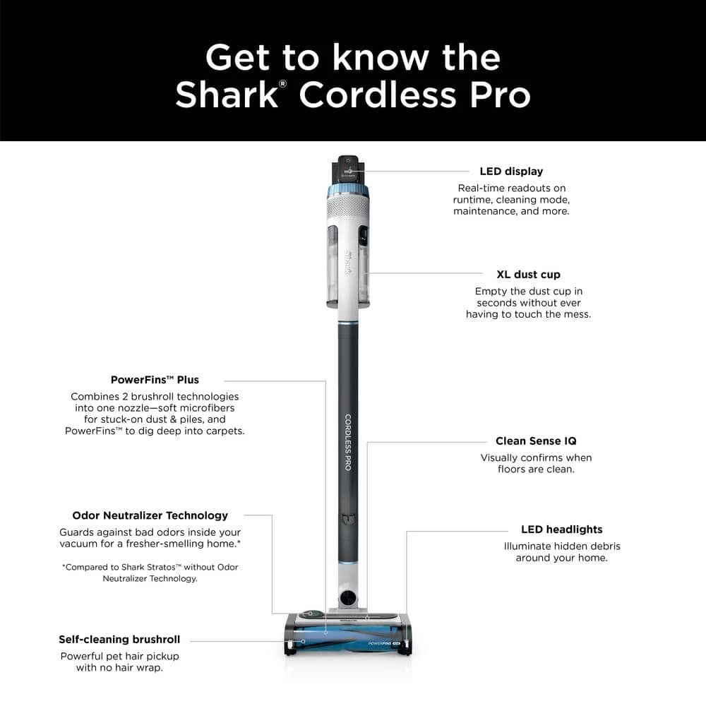 Shark Pro Cordless is Shark’s newest lightweight cordless stick with the latest cleaning technology. Clean Sense IQ detects the dirt you can’t see and automatically boosts power. The PowerFins Plus brush roll combines flexible fins and soft microfiber material for continuous contact on all surfaces. Plus, Odor Neutralizer Technology guards against bad odors from debris you pick up.