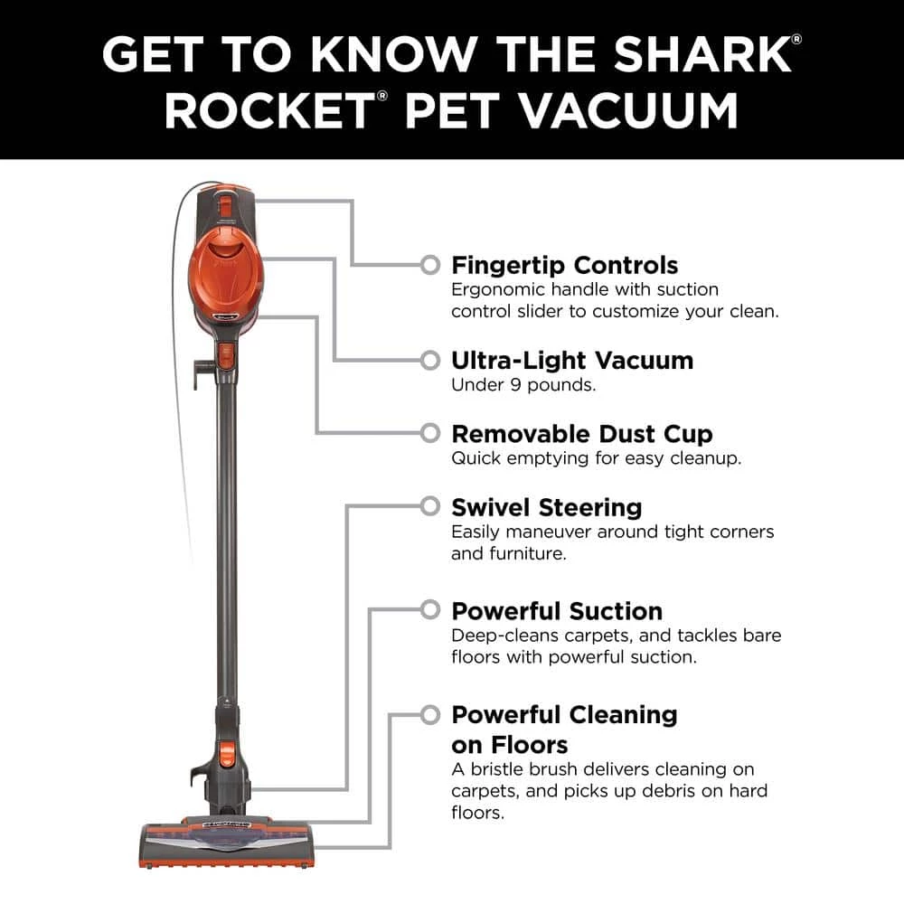 At under 9 lbs., the powerful, ultra-lightweight Shark Rocket (HV301) corded stick vacuum handles all floor types and easily converts into a handheld vacuum. It boasts nonstop corded performance for whole-home cleaning from floor to ceiling. Swivel Steering allows for excellent control in tight spaces and additional tools give you the ability to clean in crevices and tackle stubborn pet hair.