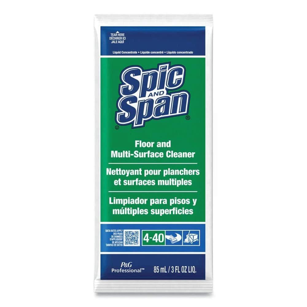 Spic and Span floor cleaner is a versatile, high-performance floor cleaner liquid detergent for easy, fast cleaning of food service grease found on floors and other areas. This Spic and Span all purpose cleaner is specially formulated for foodservice. As a multi purpose cleaner, it can be used on floors, walls, tables, food-contact surfaces and restrooms. High builder level helps remove grimy, tracked-in dirt and delivers excellent cleaning in hard water. The noncorrosive, mildly alkaline formula balances tough cleaning power with employee safety. Single-Dose Packets—Single-dose concentrated packets each make 4 gallons of cleaning product. Application: Floor Cleaner/Degreaser; Applicable Material: Vinyl Composition Tile (VCT); Solid Vinyl Tile (SVT); Linoleum; Sheet Vinyl; Laminates; Glass; Sealed Cement/Concrete; Ceramic Tile; Terra Cotta; Terrazzo; Quarry Tile; Polished/Sealed Stone; Chemical Compound: Alkaline; Dirt Types: Dirt; Grease; Grime; Oil.