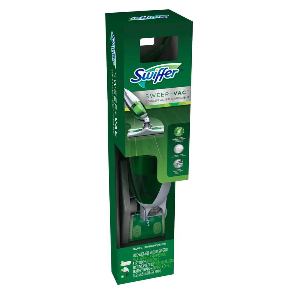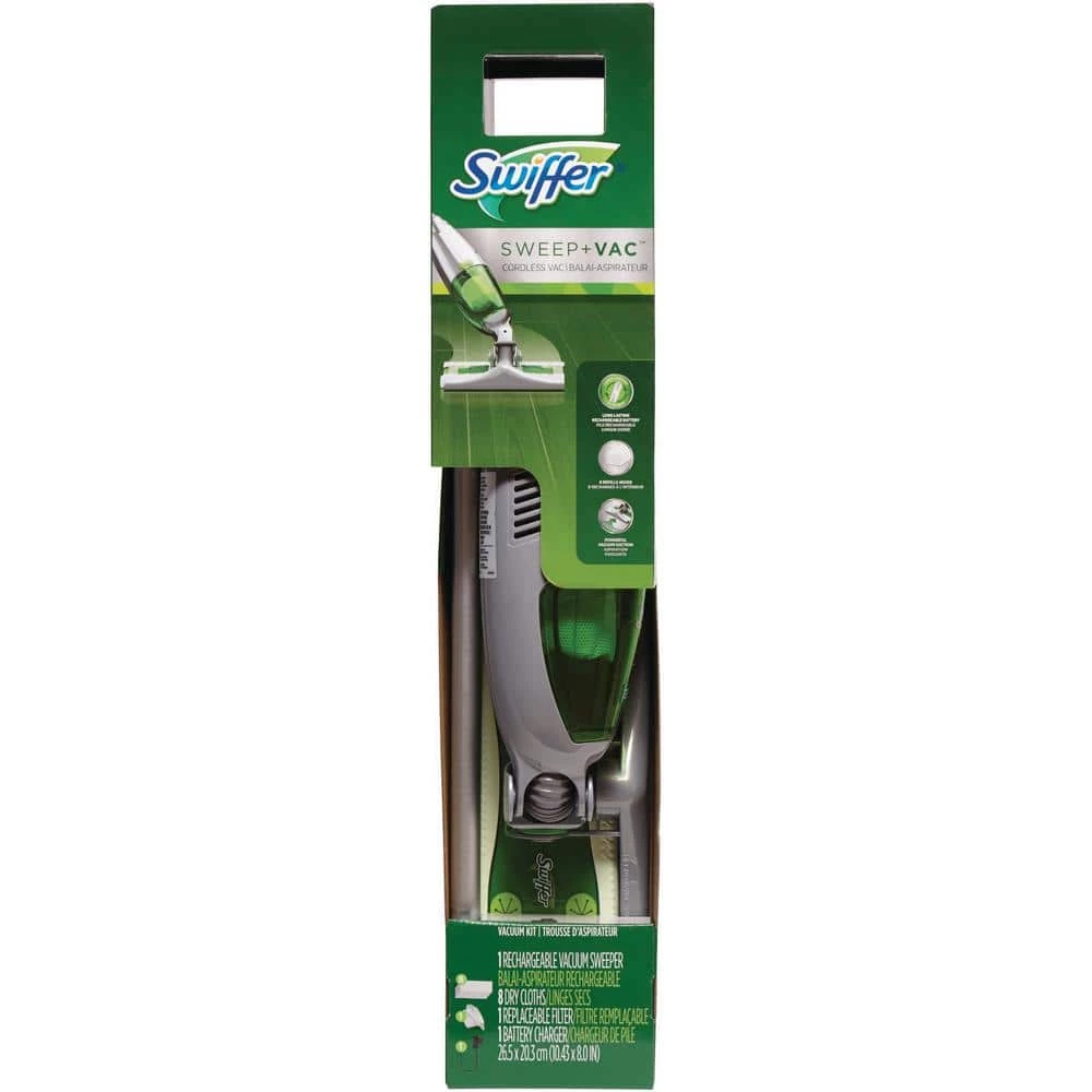 Swiffer Sweep+Vac is a rechargeable, cordless sweeping system designed to clean dirt, dust and hair. The Sweep+Vac uses a thick Swiffer Sweeper dry sweeping cloth to dig deep and pick up dirt from textured grout lines and crevices. Then its powerful vacuum grabs larger particles like crumbs. Assembly required.