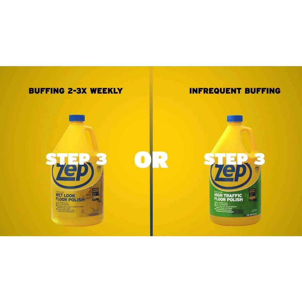 Give your floors a sophisticated look. Zep Wet-Look Floor Polish is Step 3 of the 4-Step Pro Floor Maintenance System. Can be used as vinyl floor polish and is formulated to leave a long-lasting shine. This floor polish contains 19% solids and is designed to quickly dry into a high gloss. Formula works excellent as a concrete floor polish and also provides a wet-look coating for noticeable sheen in any space. It is durable enough to resist slips, scuffs and heel marks. The high speed burnishing brings out a brilliant shine.