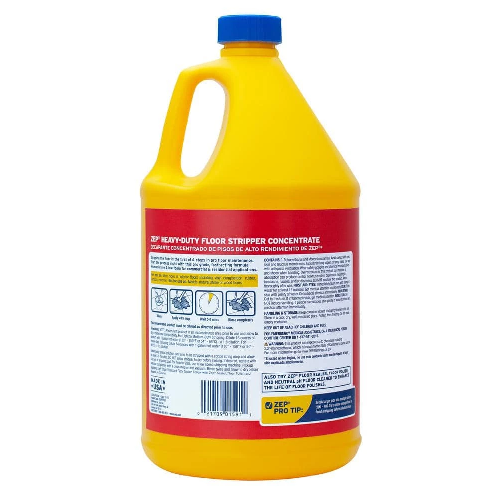 ZEP Heavy-Duty Floor Stripper is Step 1 of the 4-Step Professional Floor Maintenance System. The formula can be used as a floor wax remover. ZEP Heavy-Duty Floor Stripper removes acrylic finishes from floors in preparation for waxing. The concentrated, high alkaline, low foam formula can be applied with a mop or scrubbing machine. This product is fast-acting and ammonia free.